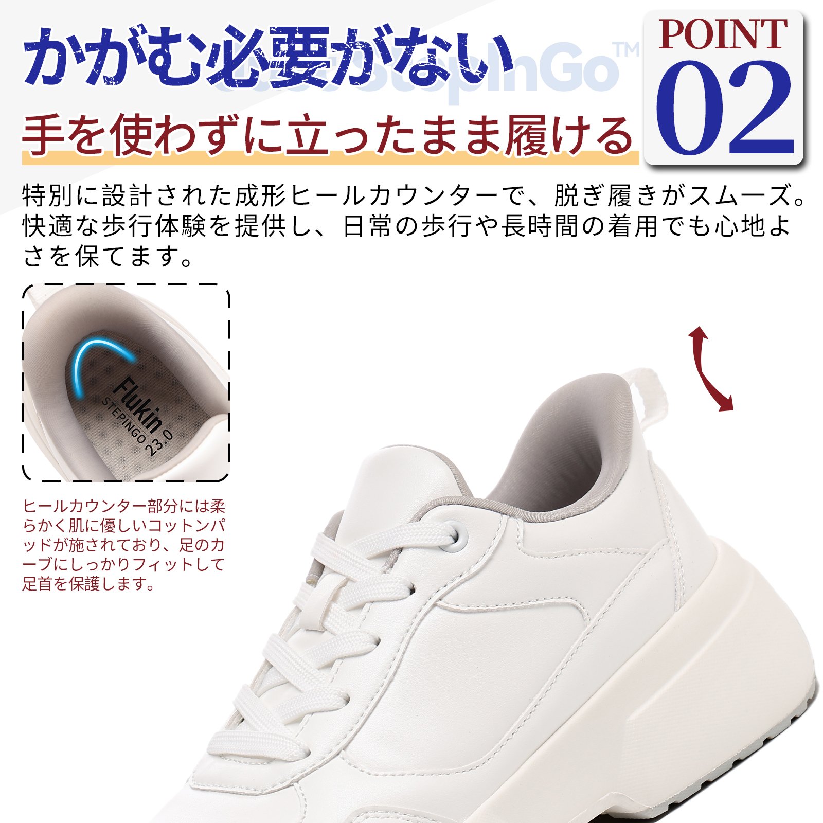 FlukinのStepInGoシリーズは、立ったまま・手を使わずスッと履ける革新的なスリッポン構造で、あなたの毎日をサポートします。
