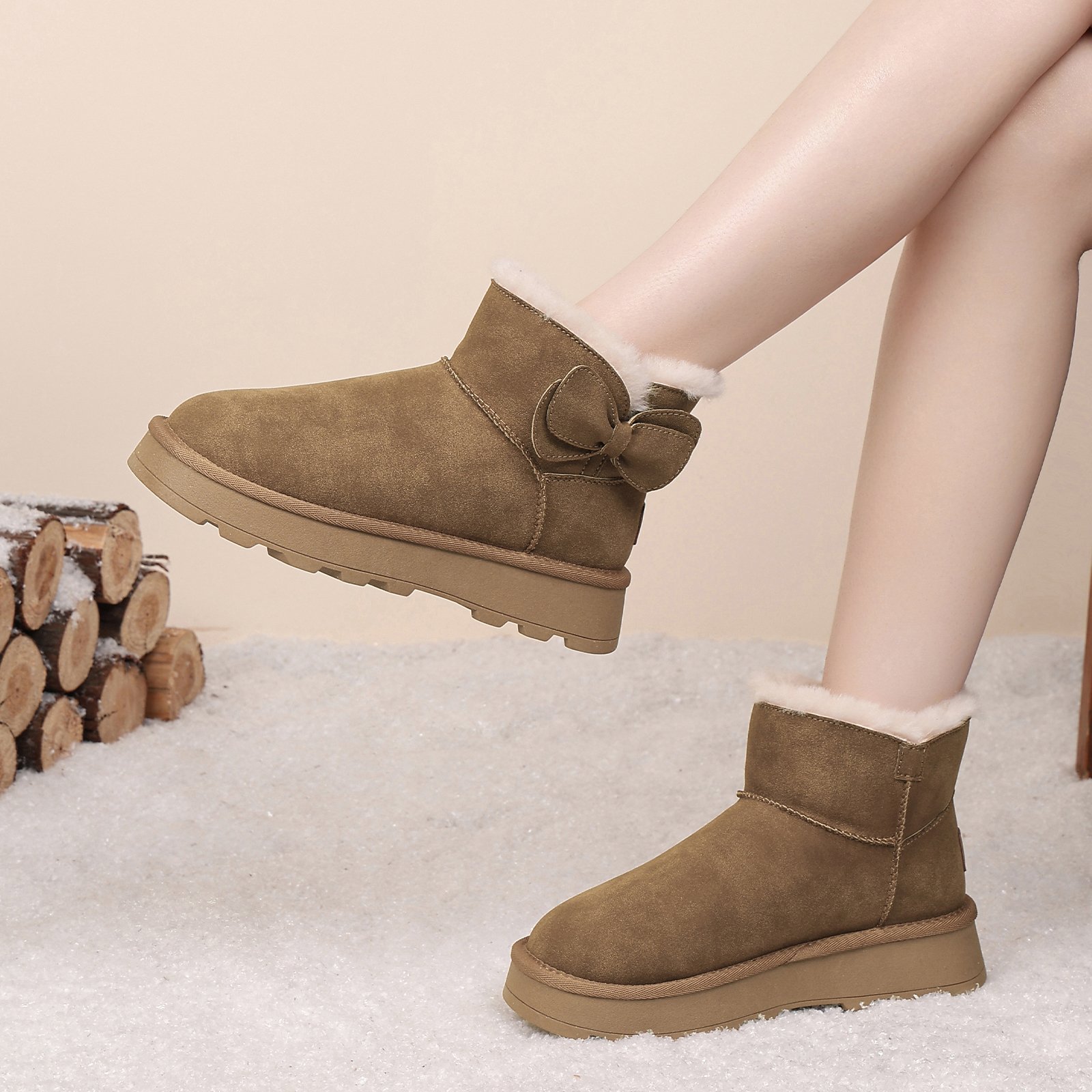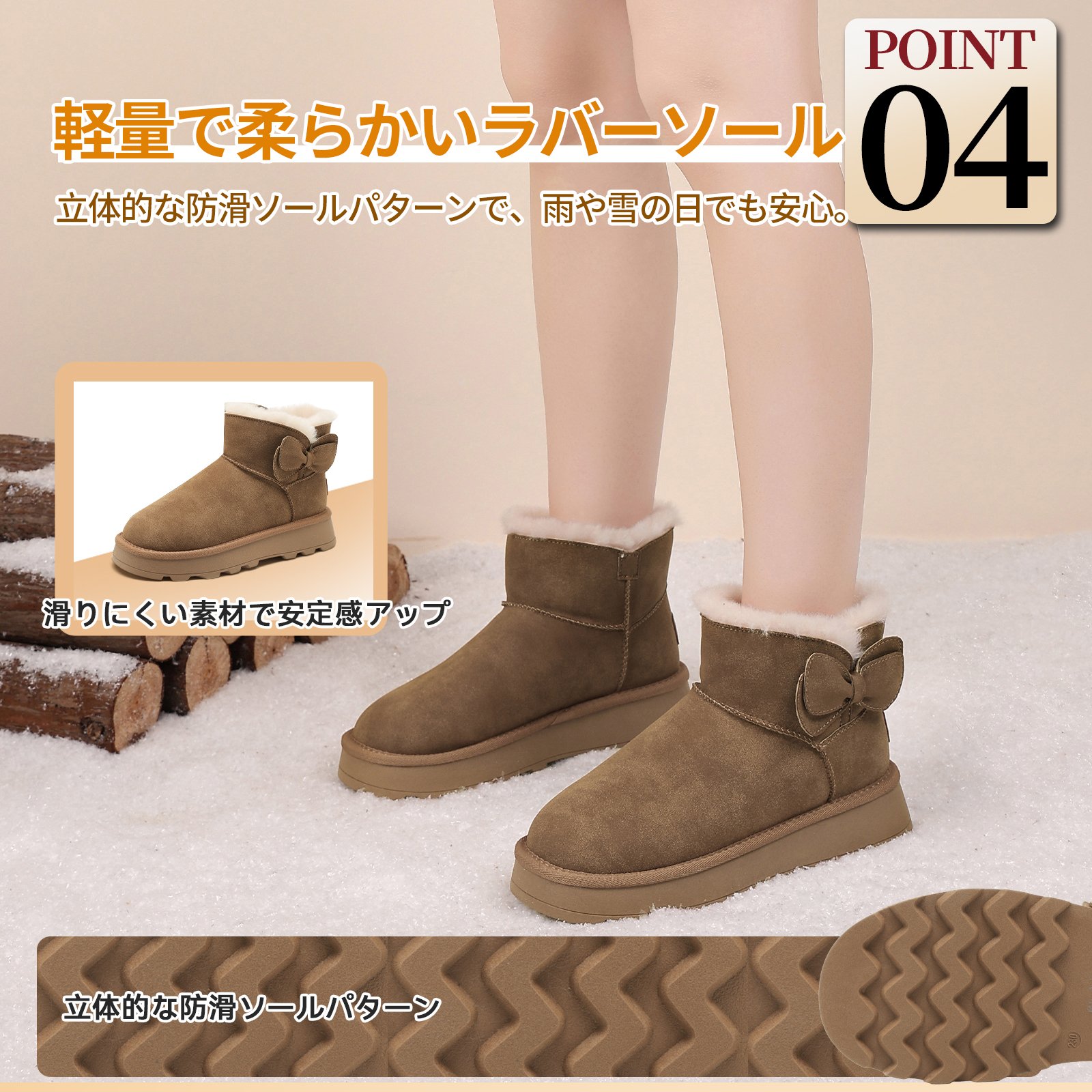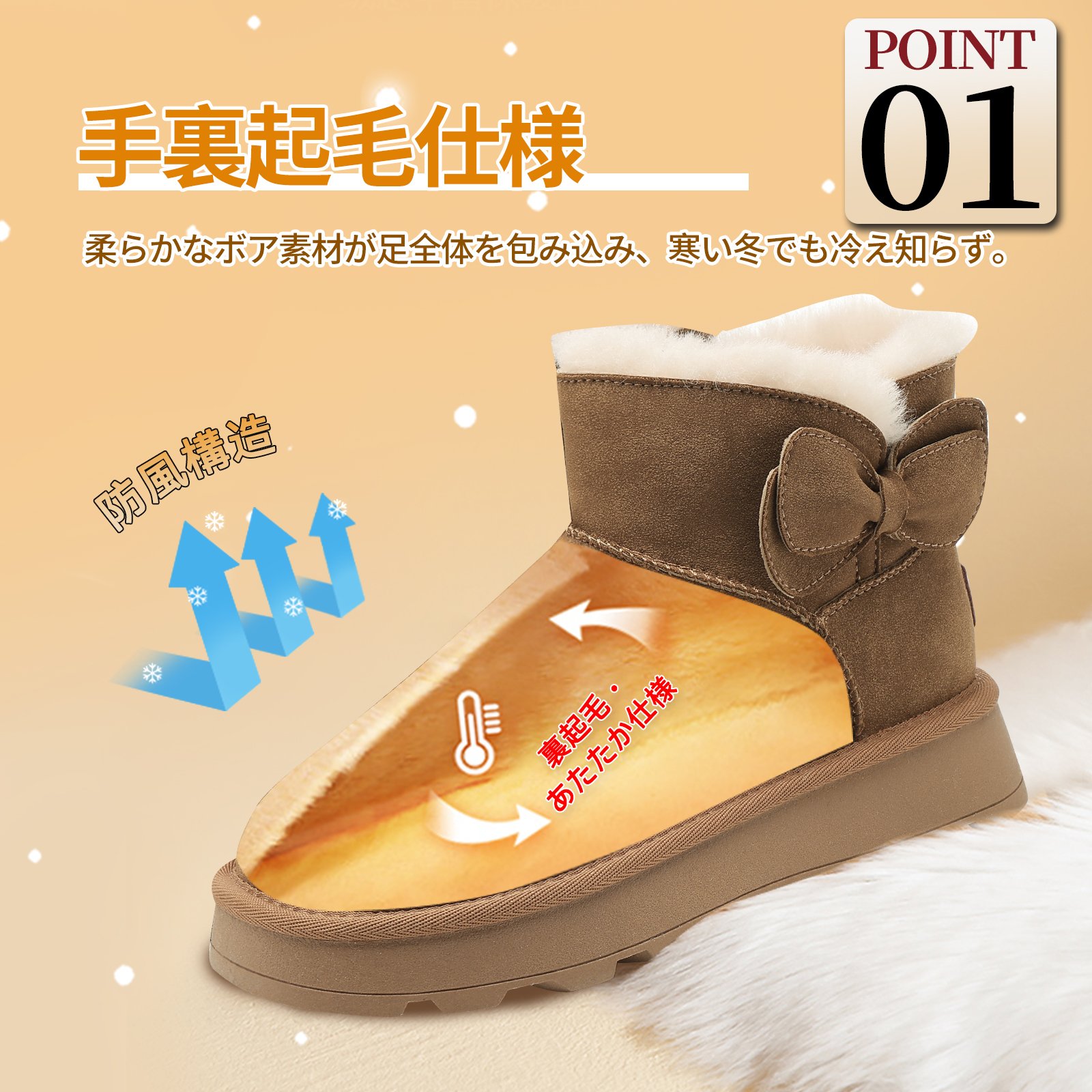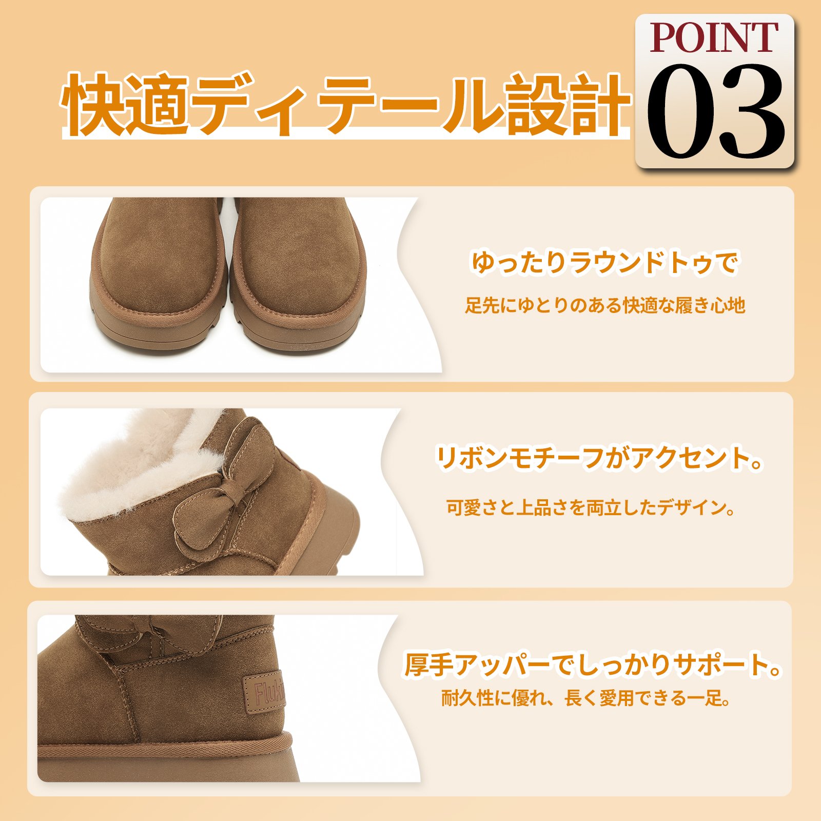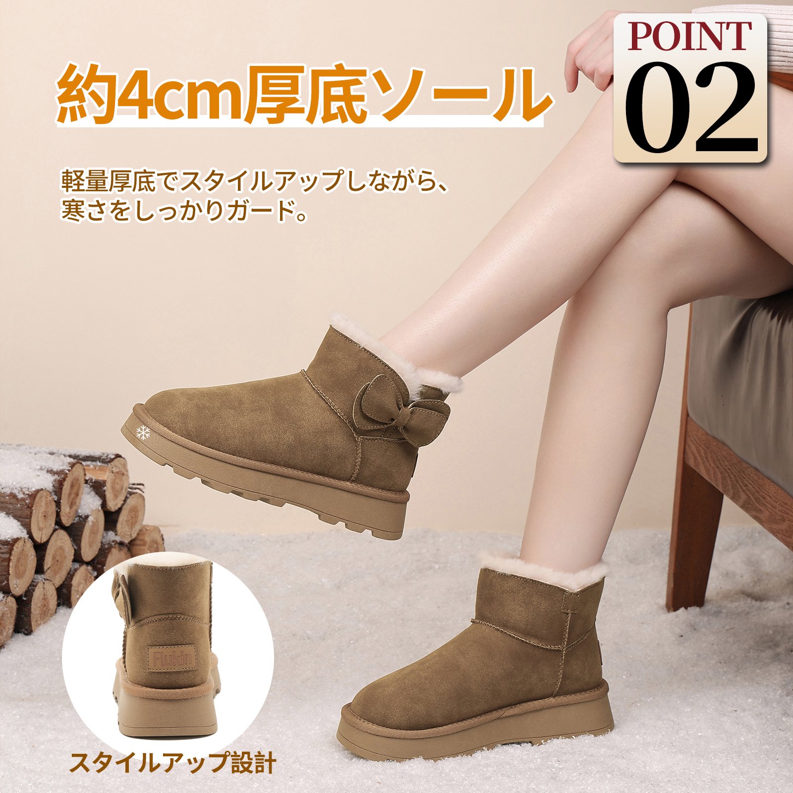 Flukinのムートンブーツは、寒い季節にぴったりのアイテムです。厚底デザインで足元をしっかりサポートし、裏起毛仕様で暖かさをキープ。蝶結びモチーフが可愛らしさをプラスし、ゆったりとしたつま先で快適な履き心地を実現します。防滑ソールで滑りにくく、安心して歩けますよ。寒い日のお出かけも、このブーツで楽しくなりますね!