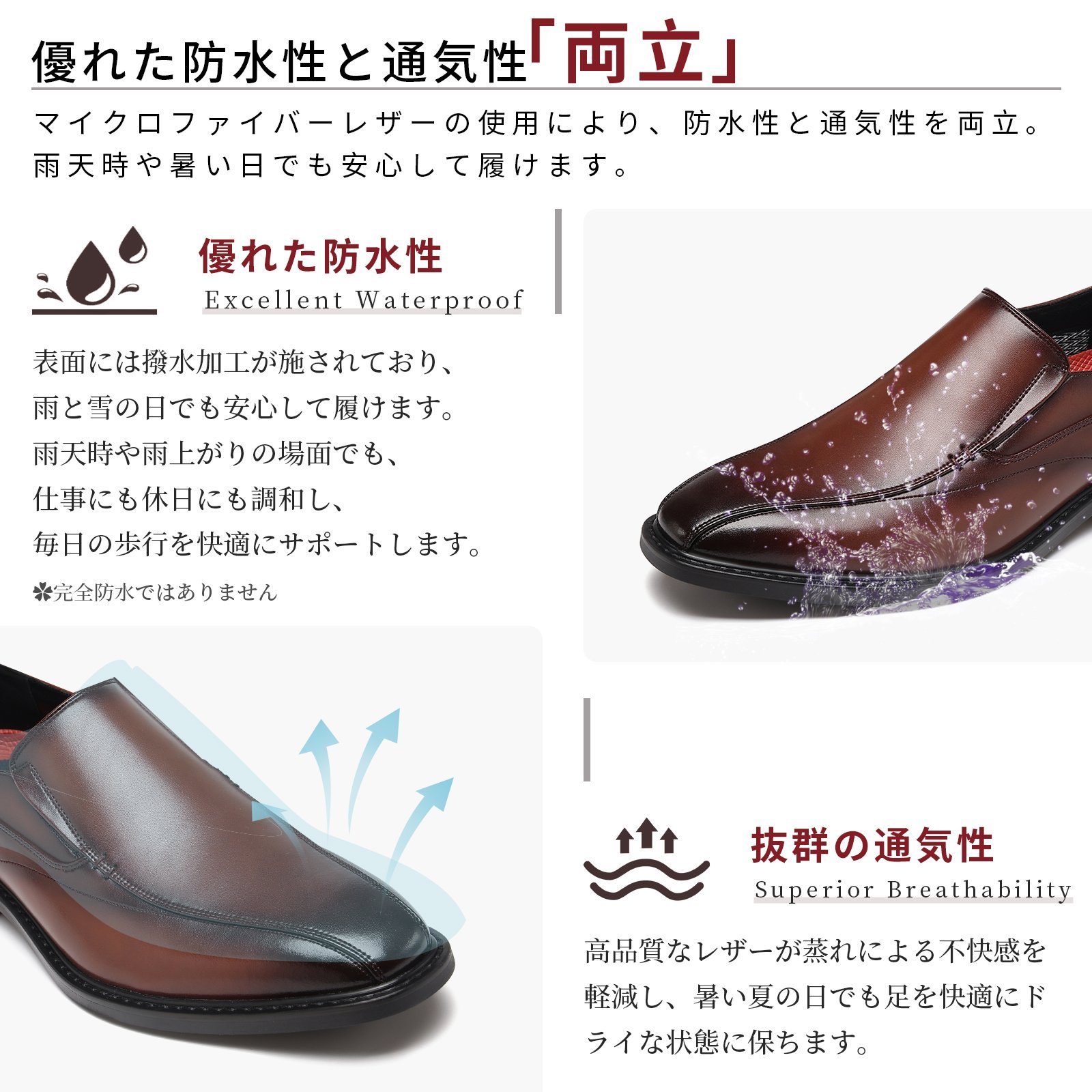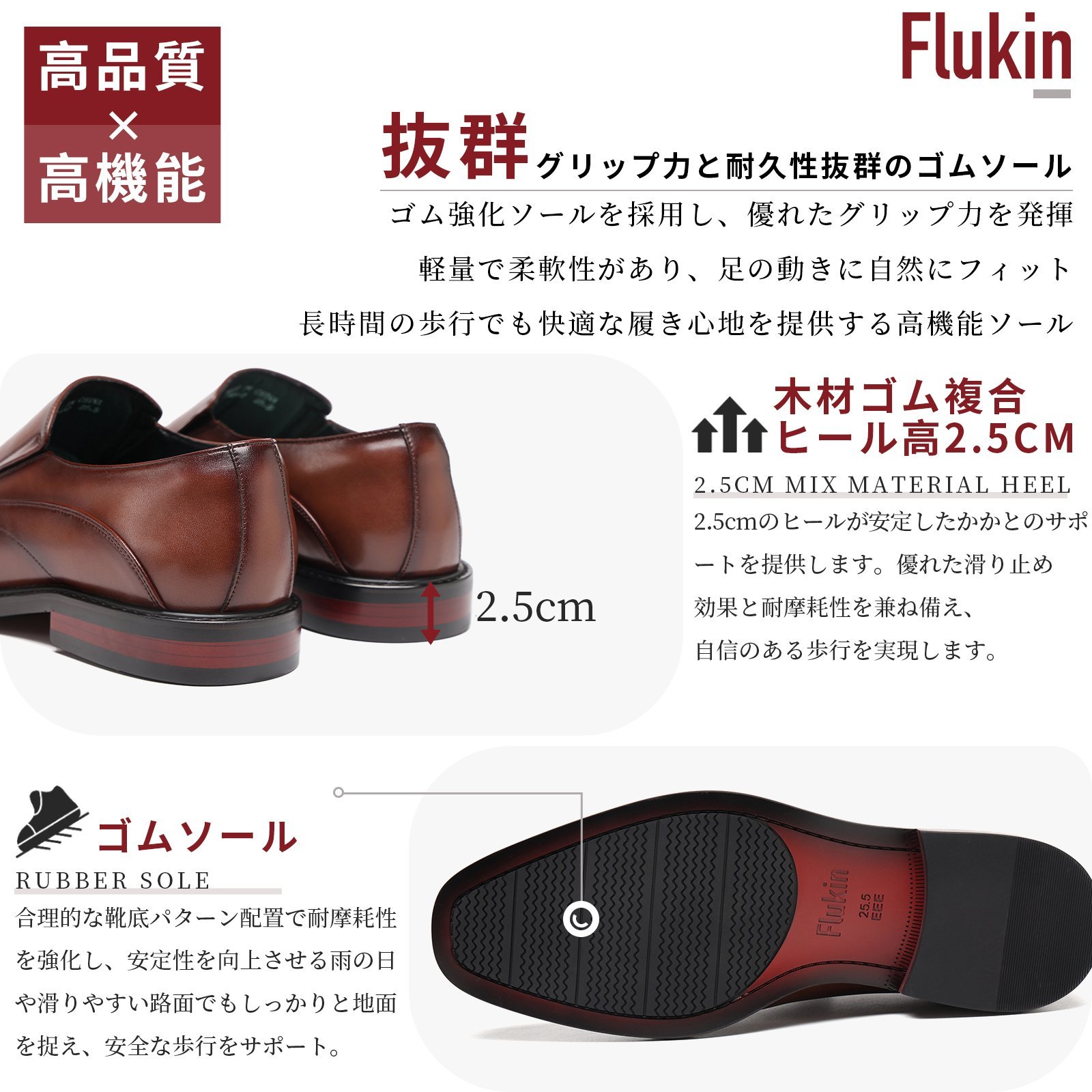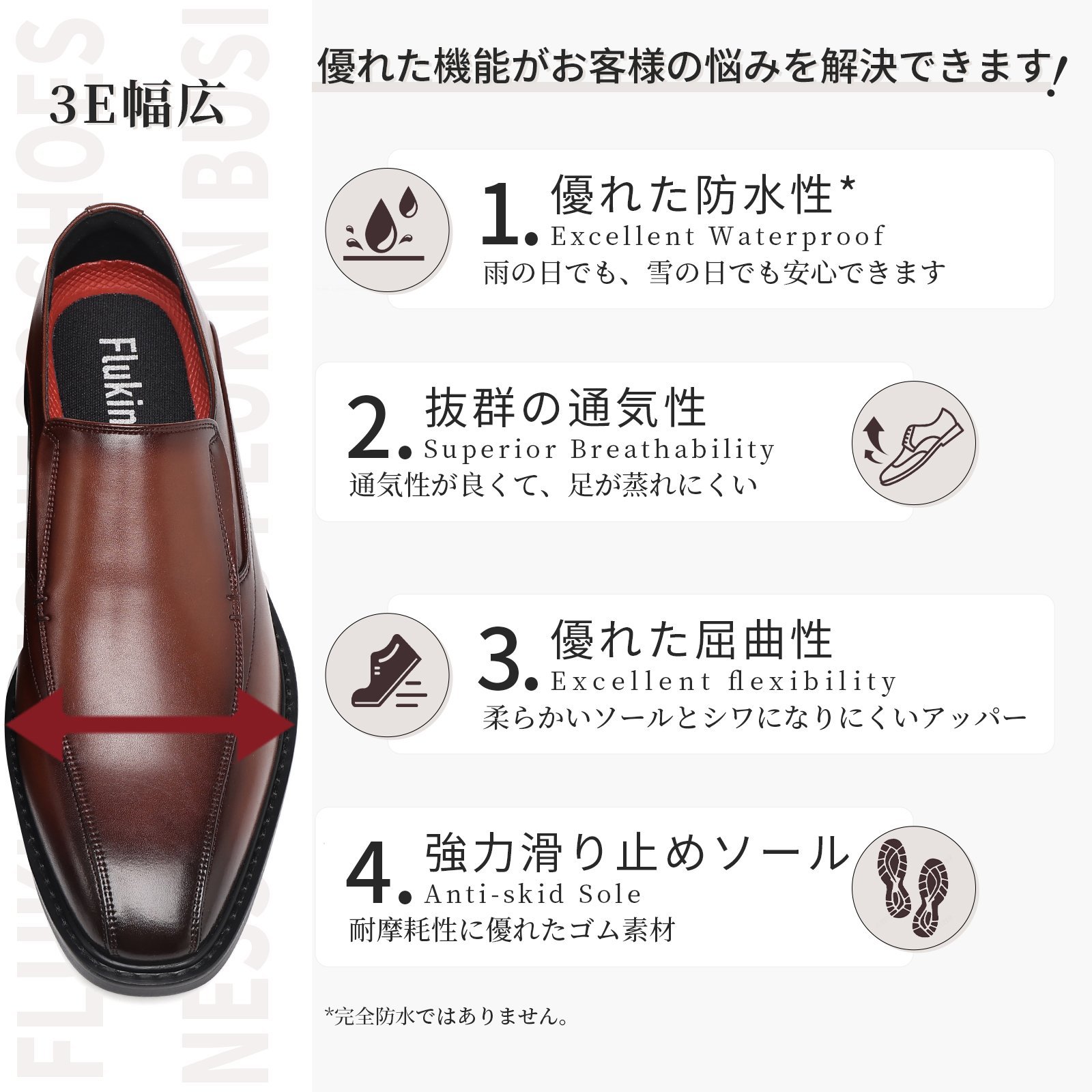 Flukin 革靴|防水・通気・滑り止めで快適!Coolmax仕様の3E幅広ビジネスシューズ